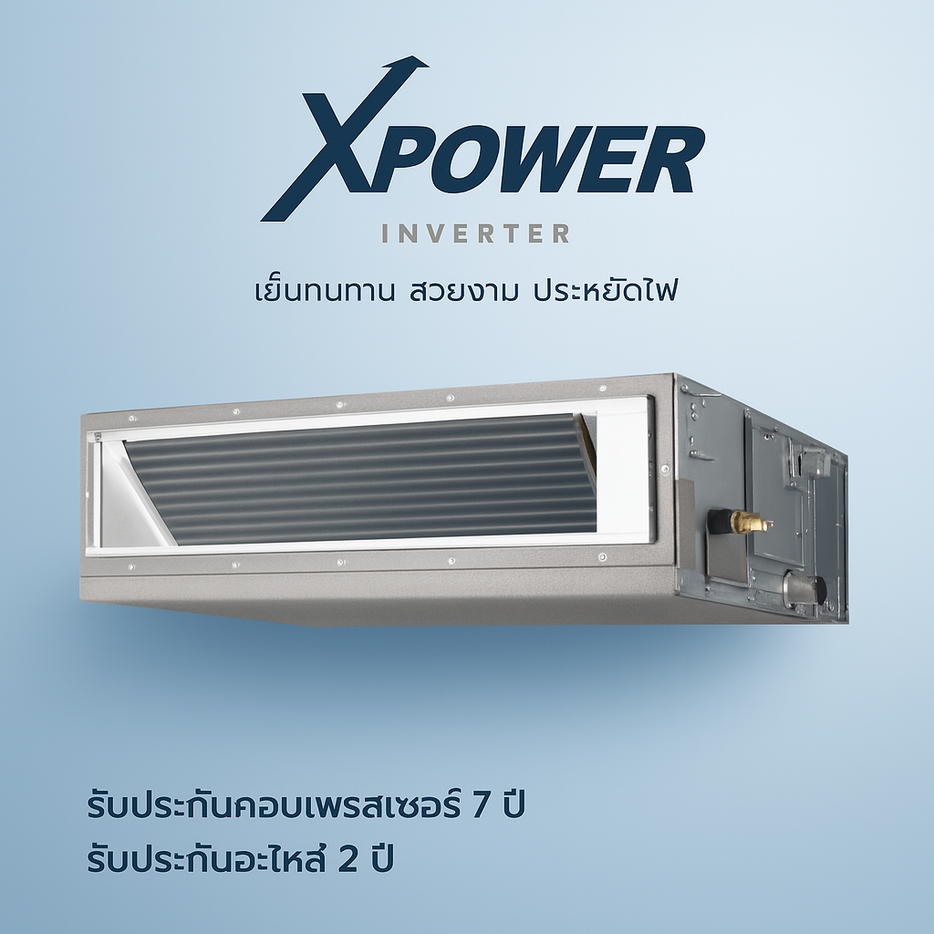 - เครื่องปรับอากาศซ่อนในฝ้าแบบท่อต่อ ประหยัดไฟกว่าด้วยระบบ Inverter สวยงาม ซ่อนรูป ตกแต่งห้องได้มากกว่า รับประกันคอมเพรสเซอร์ 7 ปี รับประกันอะไหล่ 2 ปี